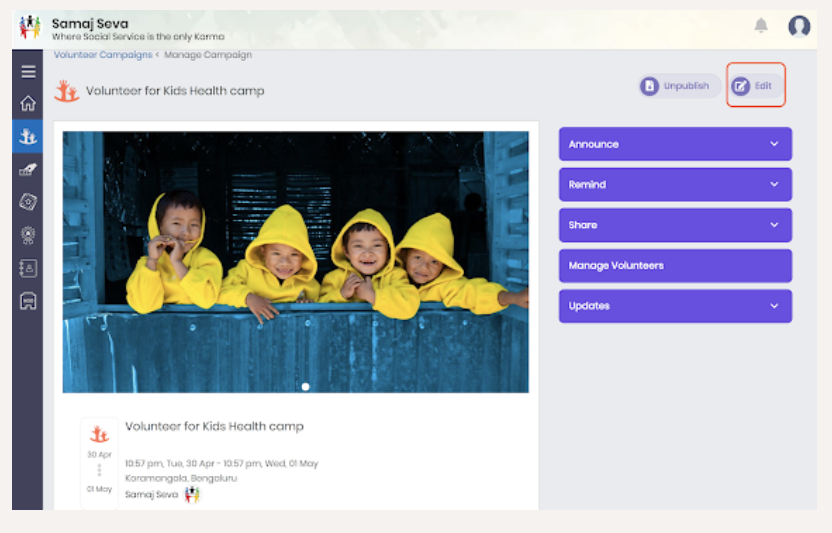 Created campaigns can be edited at anytime. To update campaign, follow below steps : 1. Go to Volunteer Campaigns 2. Click on campaign. Click on Edit 3. By default 'Detail Campaign' will be selected. Follow similar steps of 'Campaign creation' to ...