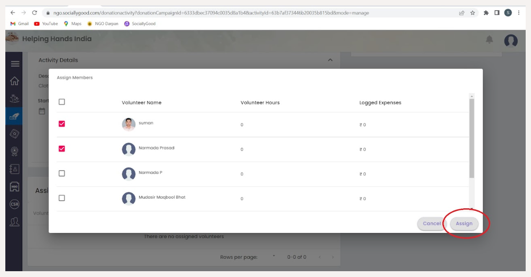 Click on Donation Campaigns from the main menu, which opens the Donation campaigns list view, and click on the campaign for which you want to approve the registered volunteers.